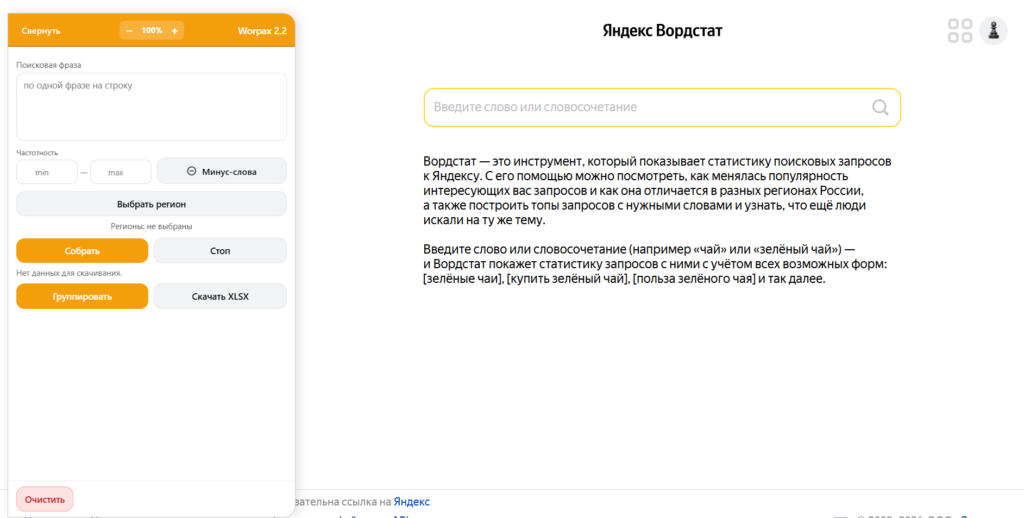 Расширение для автоматического сбора и парсинга поисковых фраз из Яндекс Wordstat с экспортом в CSV/XLSX.